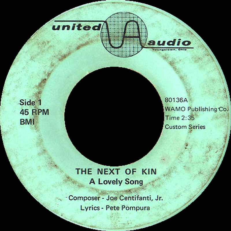 In 1967, Joe Centifanti co-wrote a few songs ('A Lovely Song' and 'Nosey Rosie') with Pied Pipers bassist Pete Pompura and them, along with the rest of the Next Of Kinn, recorded the tracks at Wam Records during the fall of that year. Pied Pipers frontman Dennis Sesonsky also contributed with background vocals. "Rosie" was considered to be too wild at the time, so the group went back in the studio to lay down a cover of Buffalo Springfield's 'Mr. Soul', which appears on the flip side of the 'A Lovely Song' single. As a side note, when the 45 was finally pressed by the United Audio label in 1968, they inadvertently misspelled the band's moniker as "Next Of Kin". The A-side of the record is nothing less than excellent and sounds like a female is singing lead, but in actuality it's 10 year old Jerry Centifanti before his voice had changed! The band never recorded any more vinyl, but played on into 1975 with Frank Elisir (drums) replacing Softich for the last couple of years.