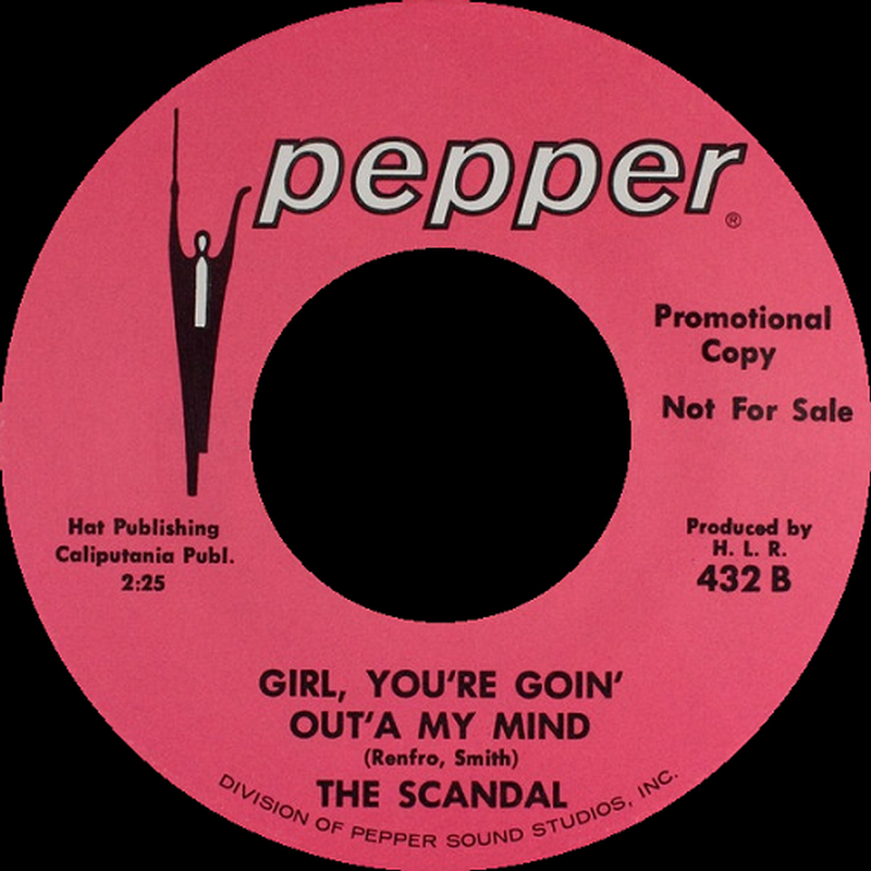 Raspberry, having some pull in the business, was able to secure the Scandal a record deal with the Pepper label and produce their sole 45 ('There's Reasons Why' b/w 'Girl, You're Goin' Out'a My Mind'). Both songs were originals written by Renfro and Smith, with the outstanding B-side being featured here on TWOS. The group eventually broke up when Renfro joined the Navy in the spring of 1968. He later ended up marrying Thorton, while Farrante got hitched to Raspberry!