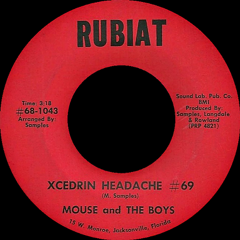 In 1968, the ensemble added a second drummer in Pete Rowland, but after only two gigs of playing tandem skins, Vaughn was drafted to Vietnam and Rowland took over sole duties. They also shortened their name to Mouse And The Boys and issued the garage-psych monster 'Xcedrin Headache #69' on the Rubiat label. The song is nothing less than excellent and deservedly hit the #1 spot locally with its hammering guitar, wild phasing and unexpected, well place tempo changes. The band was a local favorite and continued on into the early 70s before finally calling it quits.