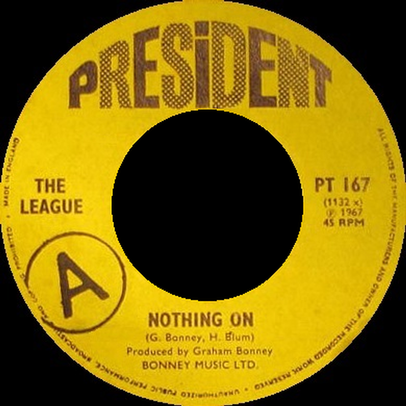 In late '67, they issued their one single as the League (the randy 'Nothing On' b/w 'Hey Conductor') on the President label. The A-side is a bit cheeky, but does work in its own weird way thanks to Cleave's pronounced lead guitar playing.