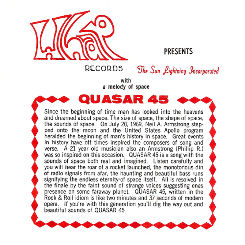 Not much is known of this short-lived Indiana outfit that evolved out the Sangralads in 1969. Members included Phil Armstrong (keyboards, vocals), Rocky Lillard (guitar, vocals), Mike Sisson (bass, vocals) and Bill Thompson (vocals, drums). The issued one 45 (the excellent instrumental 'Quasar 45' b/w 'There Must Be Light') on the Whap label later in the year. The cover of the record is rather unique with it describing how Armstrong, having the same sir name as astronaut Neil Armstrong, was inspired to write the A-side after the first landing on the moon. It further describes 'Quasar 45' as "a song with the sounds of space both real and imagined. Listen carefully and you will hear the roar of a rocket launched, the monotonous din of radio signals from afar, the haunting and beautiful bass runs signifying the endless eternity of space itself. All is resolved in the finale by the faint sound of strange voices suggesting ones presence on some faraway planet." Unfortunately it didn't sell that well, prompting the band to call it quits soon after its release.